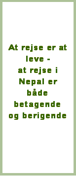 Det kan måske synes temmelig primitivt, absolut ikke på niveau med forholdene på en charterrejse. Men det er netop det, vi finder tiltrækkende. Alt kan ske, selv om man har forberedt sig godt. Vi fik mange personlige venner på turen, bl.a. en skolebestyrer i Pokhara, som havde etableret en non-profit English Boarding School for ca. 200 børn.